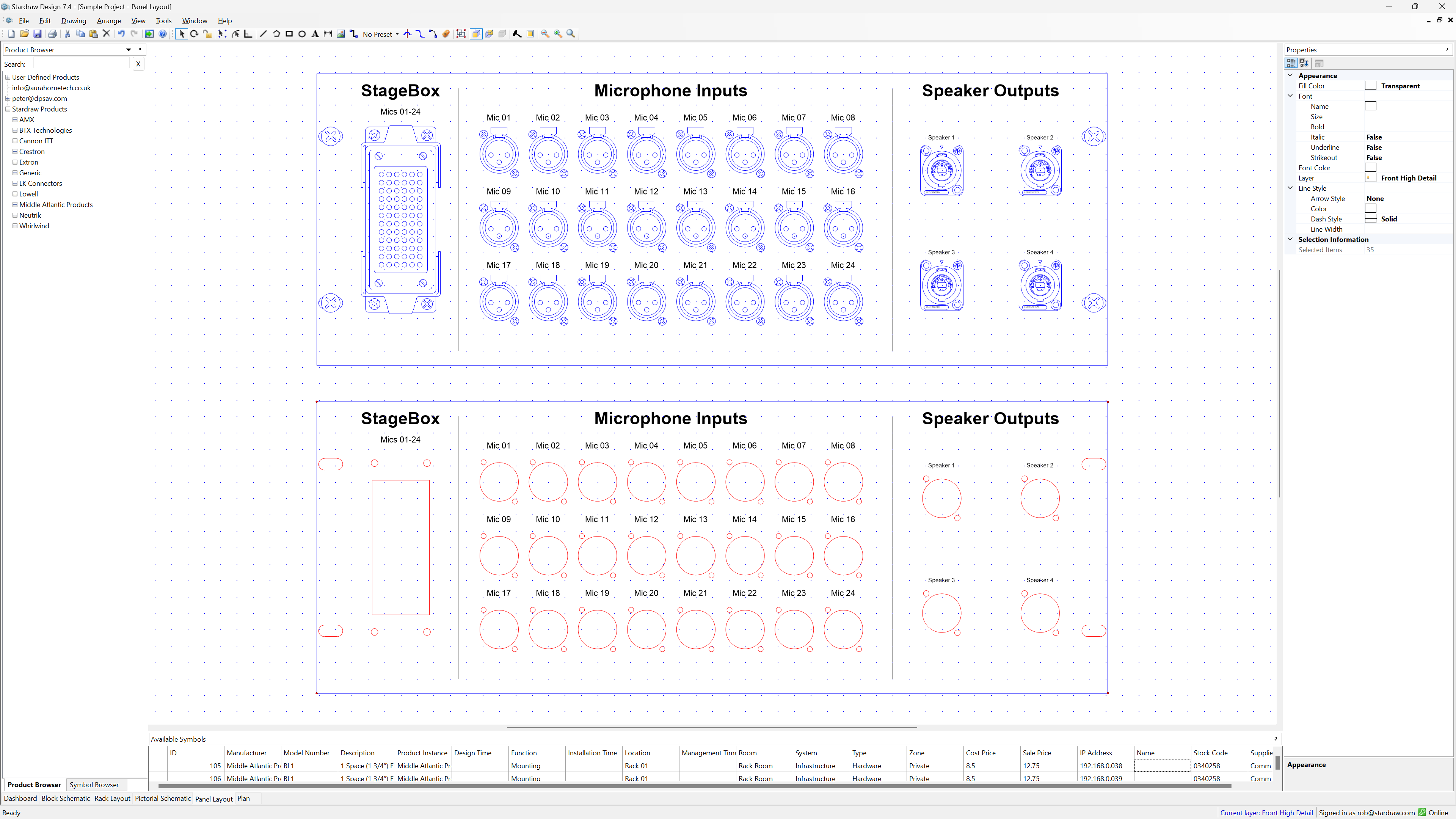 Panel Layout symbols are of connectors, rackmount blank panels and standard electrical panels. Connector symbols are highly detailed line art at 1:1 scale showing front view, cutout details for panel manufacture and, where data is available, rear details including pinouts.