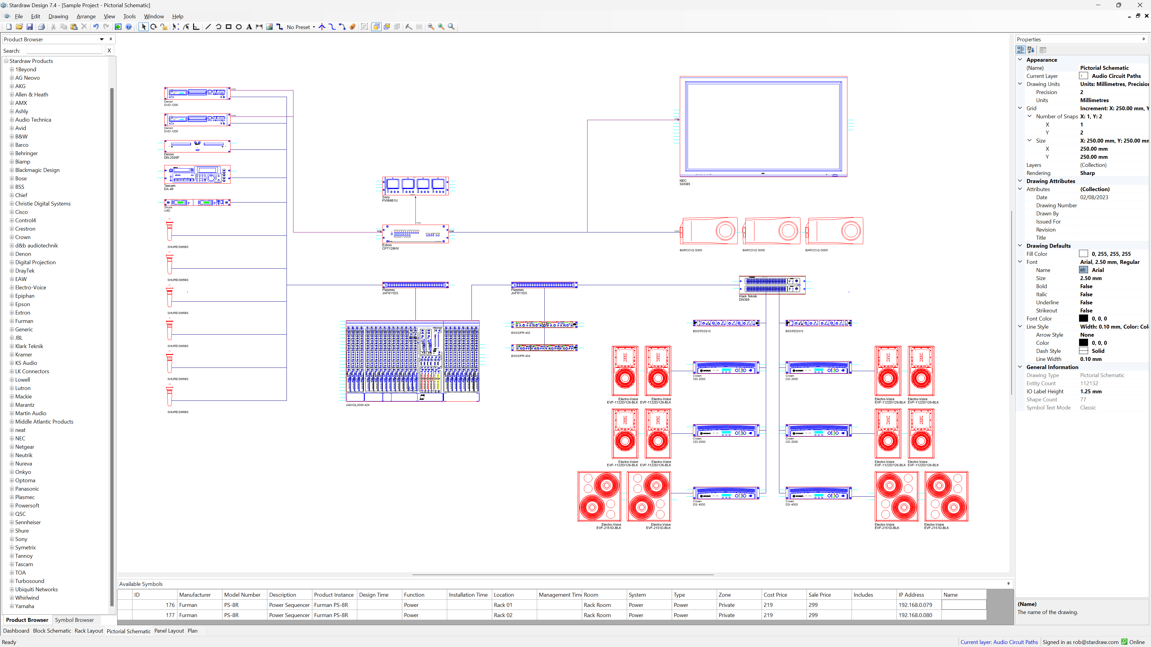 Default layers for front and rear views, and circuit paths including Audio, Video, Lighting, Power and Control.
